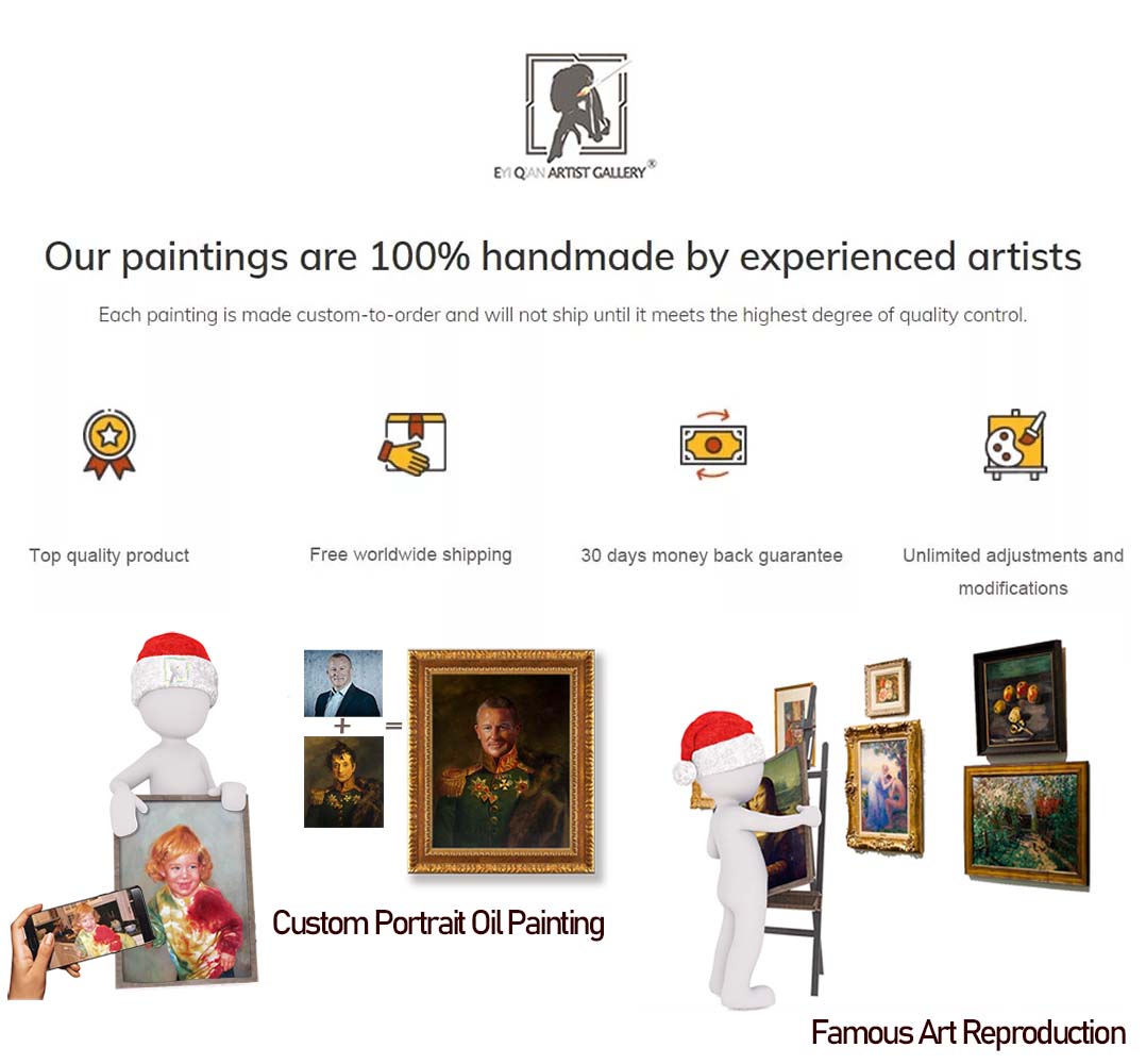 EQ Artist Gallery belongs to Xiamen Yiqian Crafts Co., Ltd. Now in our 15th year, we make it possible for everyone to own a museum-quality reproduction of any famous masterpiece and turn their photographs into beautifully crafted handmade portraits.